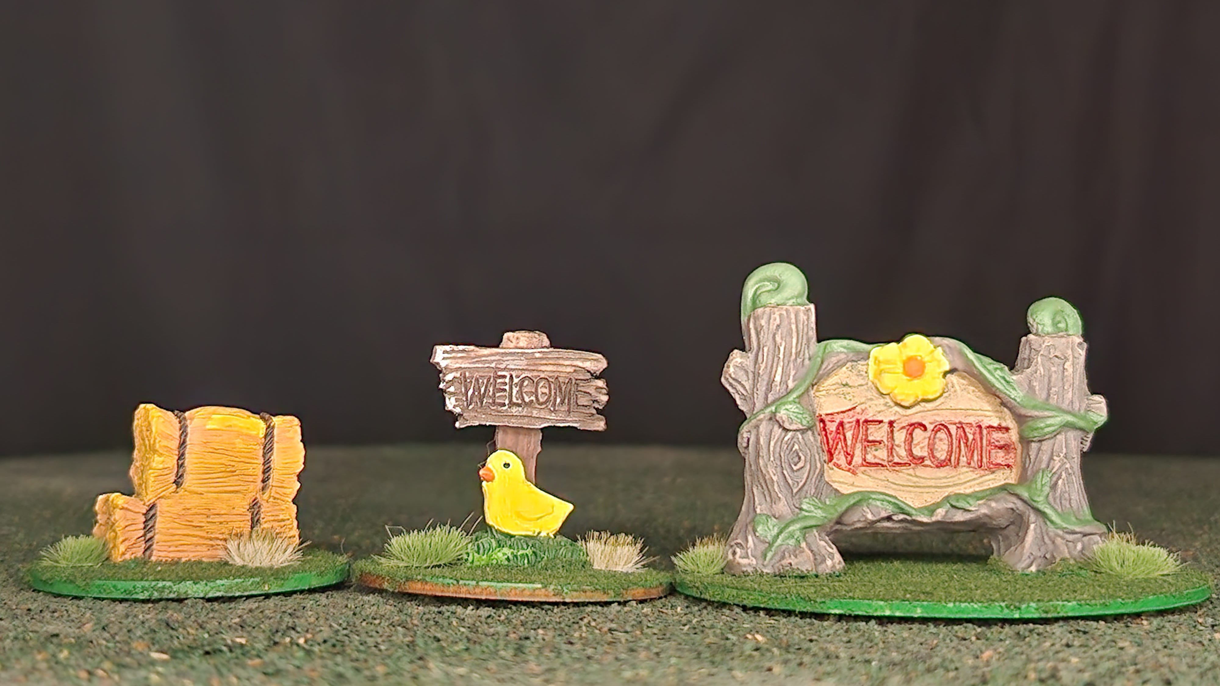 Here are some scatter terrain pieces that I made from items from Dollar Tree. I just glued them to wooden disks then added some flocking and grass tufts. They are a little cartoony looking but would fit right in on a table for young players.