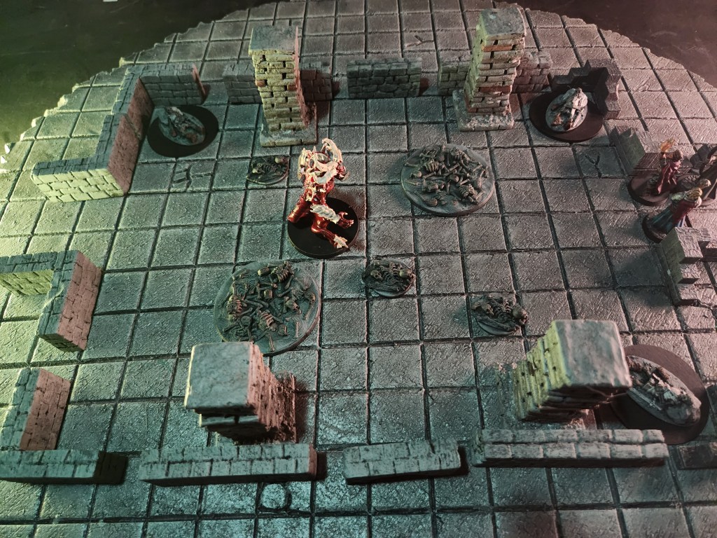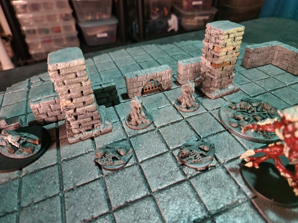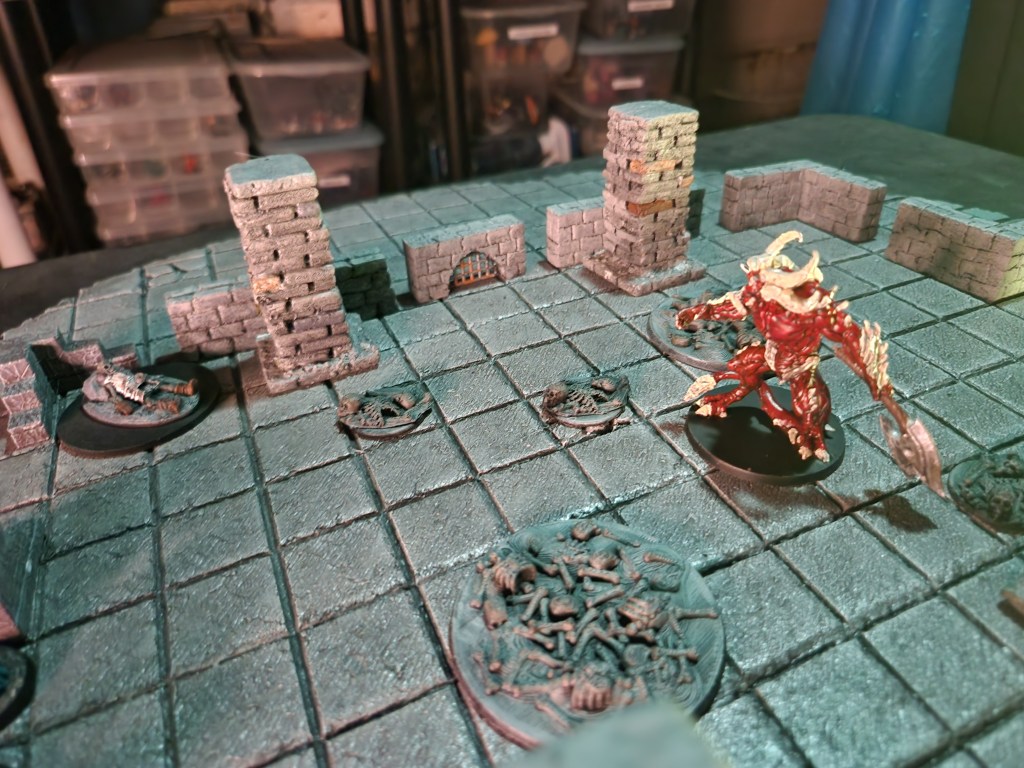 The text mentions piles of bones and weapons scattered on the floor. I pull out my bone piles and skeletons and place them on the floor. Those areas will be difficult terrain. These piles are the remains of the previous adventurers that stumbled in the path of the demon. Apparently, it has been here for a long time.