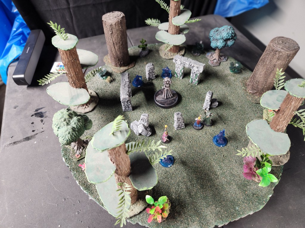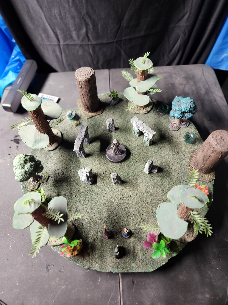 We start off with the grassland UDT. We place a statue of the deity in the middle and surround it with the pillars from the druidic circle. We place some trees around the outside to signify the clearing for the encounter as well as some small forest scatter terrain pieces. We leave an opening for the party to enter the clearing.