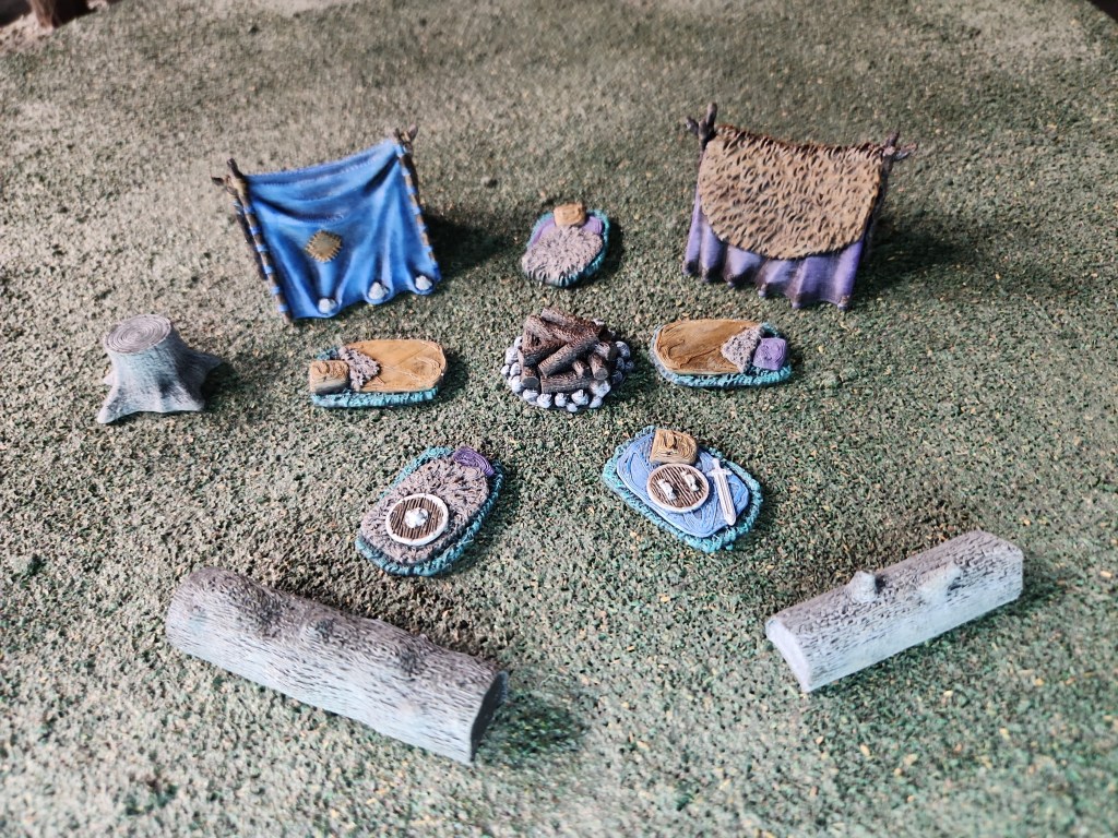 I printed out and handed up a campsite. These are great for those random encounters that happen when the party is trying to rest in the wilderness. You can lay out the campsite on the map, ask the players to set their miniatures where they would be sleeping/guarding, and then drop the monsters on the board. These pieces will end up on my eBay store.