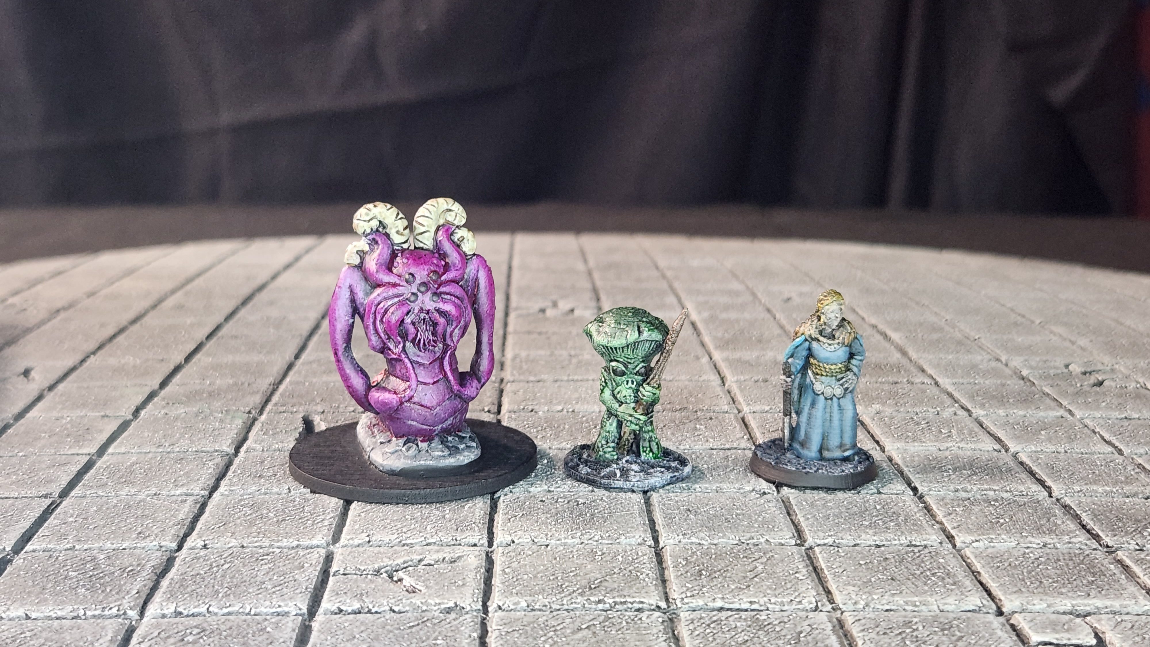 An alien (Aliens Vs. Human Tub), a mushroom folk (Fat Dragon Games), and a barbarian woman (BriteMinis)