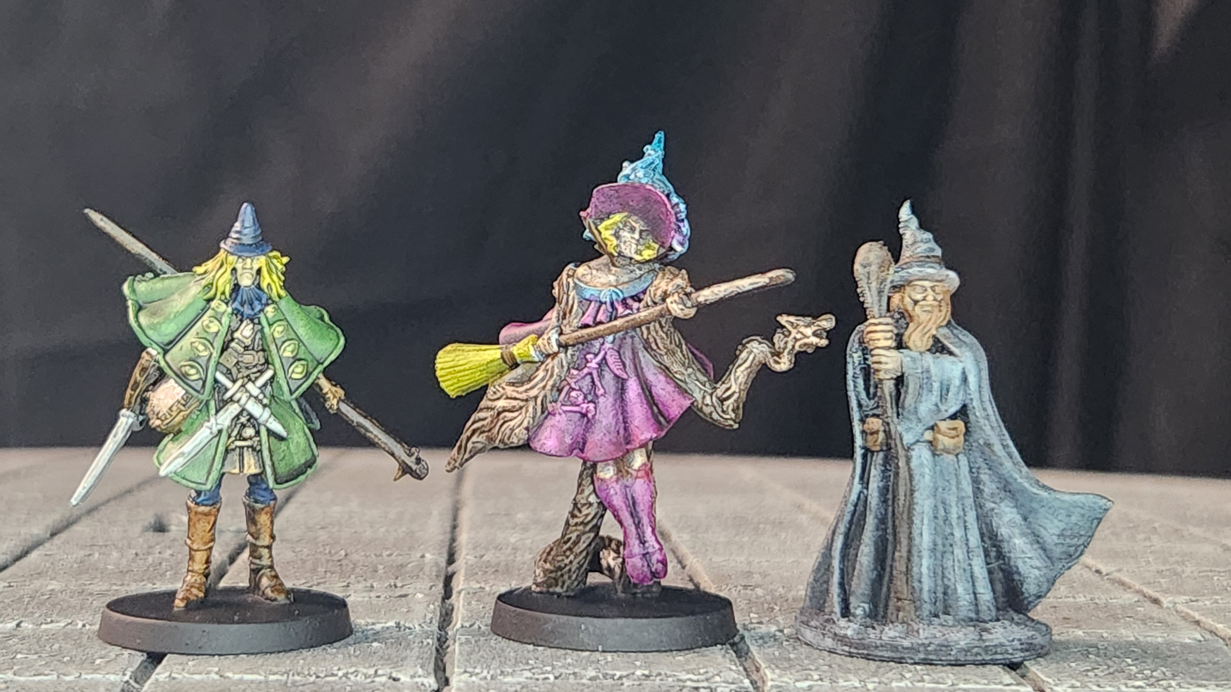 A hunter (Massive Darkness 2), a witch on a broom (Massive Darkness 2), and a wizard (Fat Dragon Games).