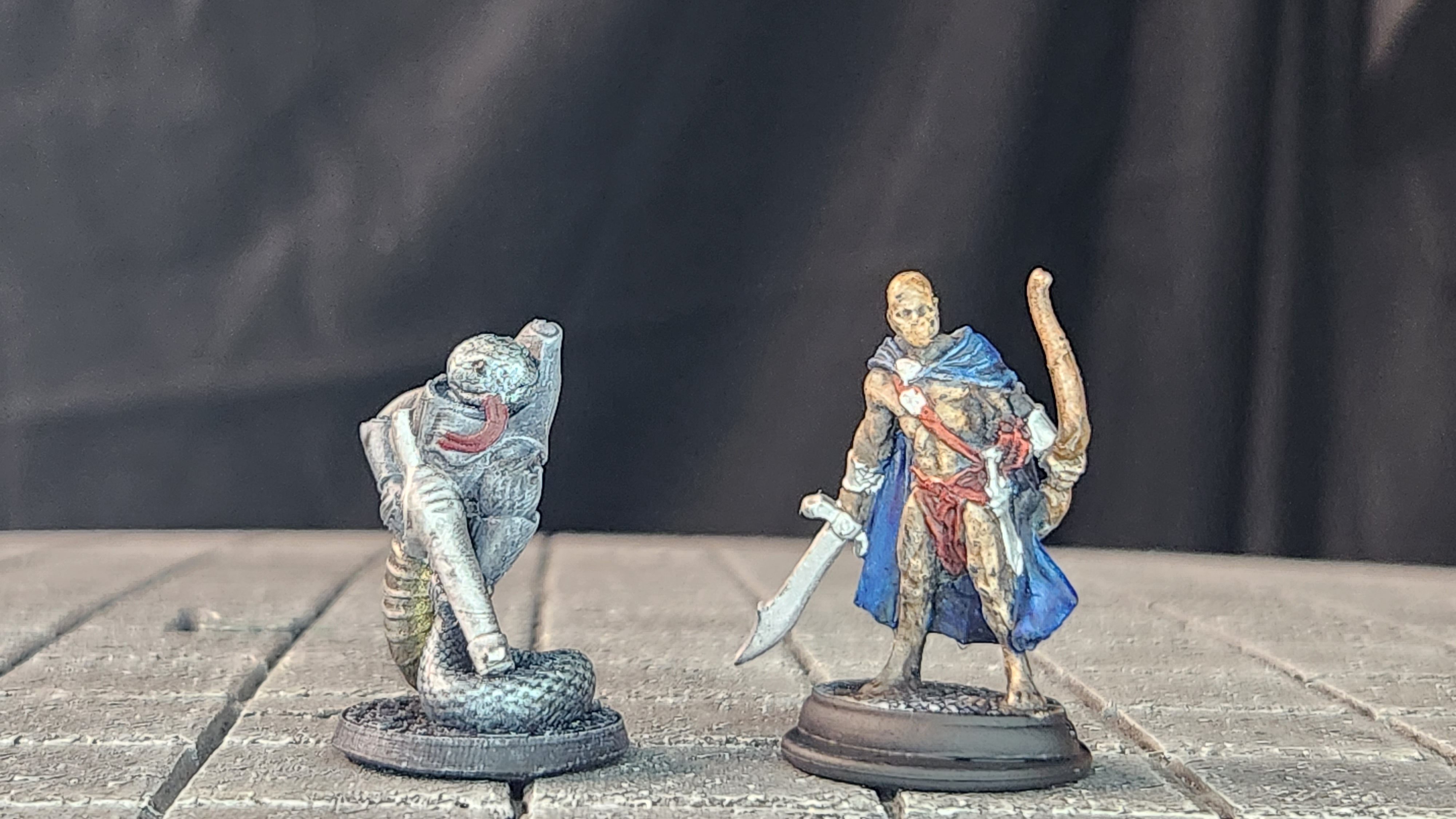 An alien snakeman (BriteMinis) and a scout (Reaper Bones 5)… I really don’t like the paint job on the scout. The snakeman was painted with iridescent paints so it has a slight shine. I like it.