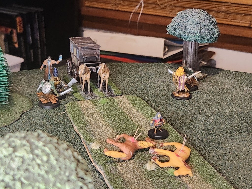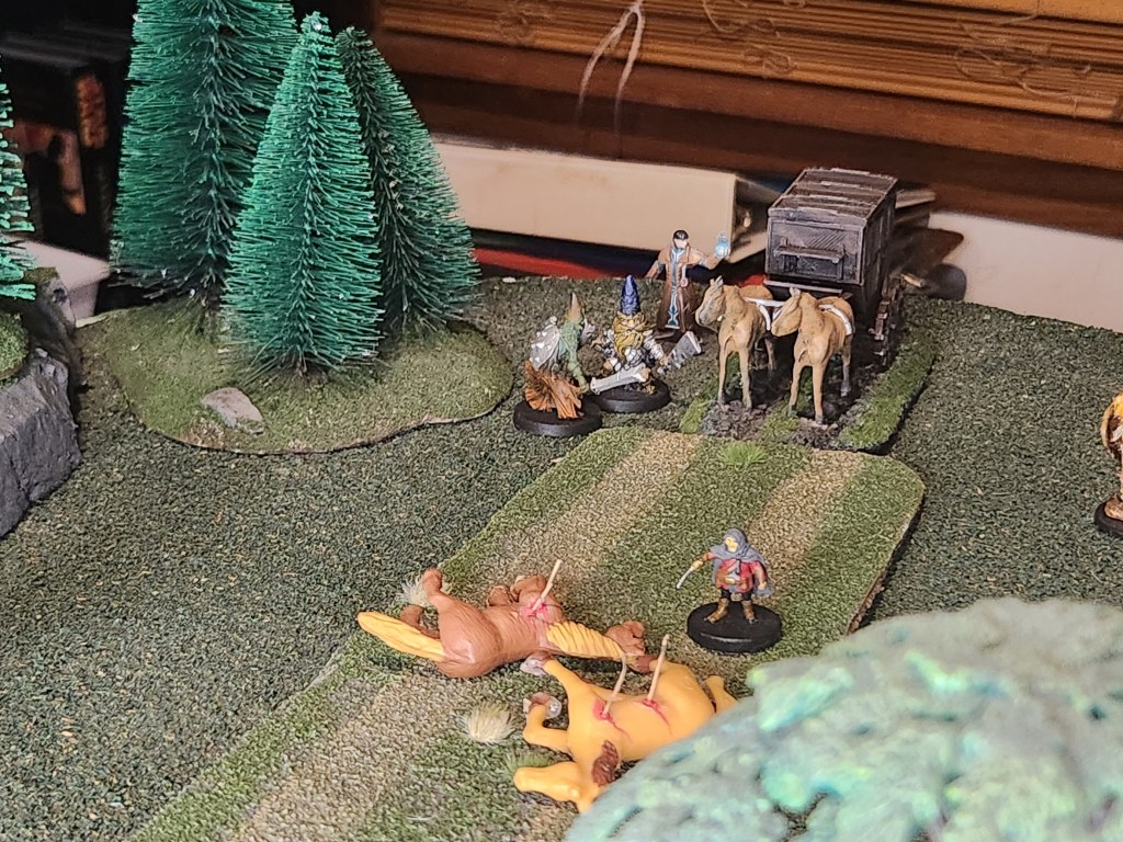 As the party travels down the Triboar Trail towards Phandalin, they spot a couple of dead horses blocking the road ahead of them. Each has several black-feathered arrows sticking out of it. The woods press close to the trail here, with a steep embankment and dense thickets on either side.
