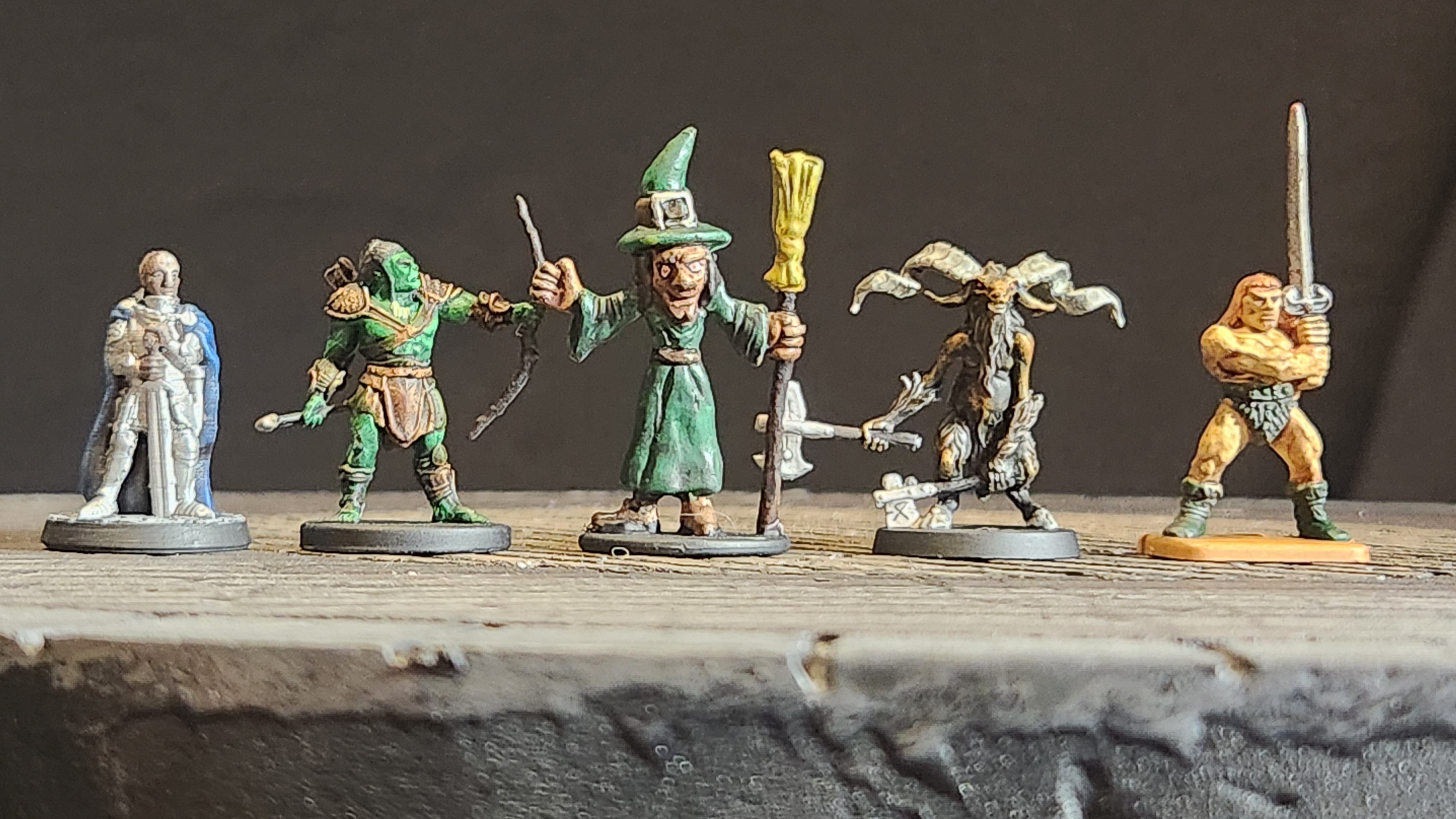 A knight (Brite Minis), an orc archer (Wizkids), a witch (Dollar General $1 pack), a beastman (Massive Darkness 2), and a barbarian (HeroQuest).