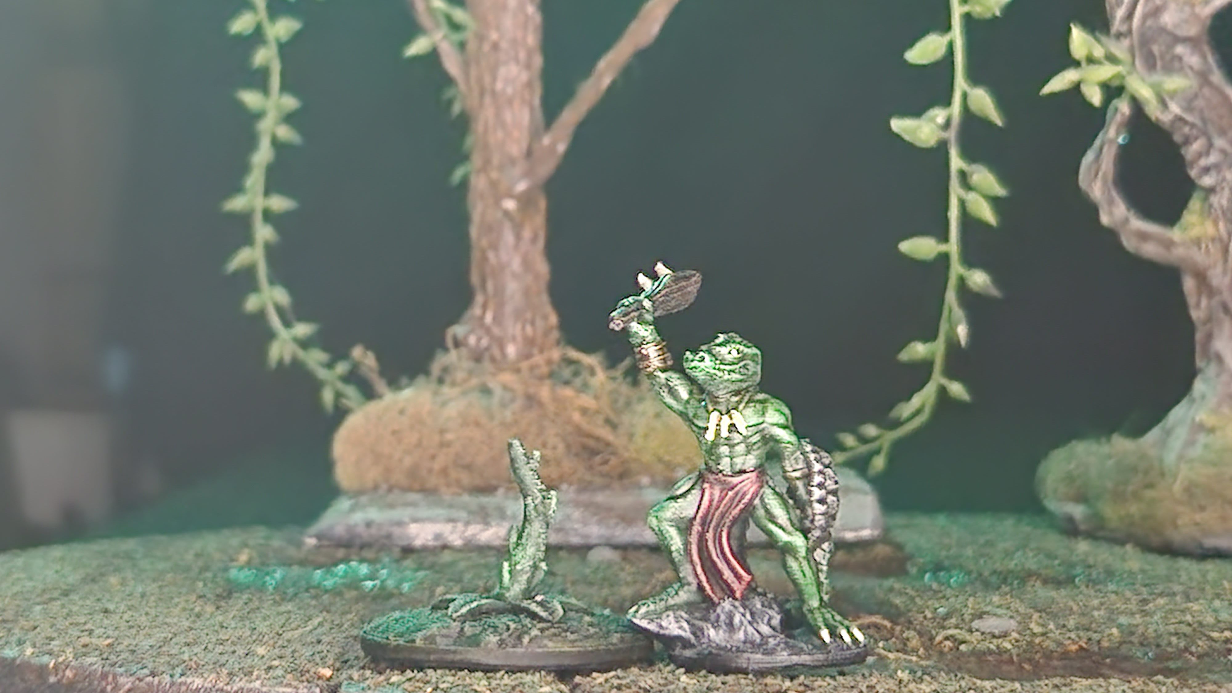 A lizardman warrior faces off against a strangler vine in the swamp.