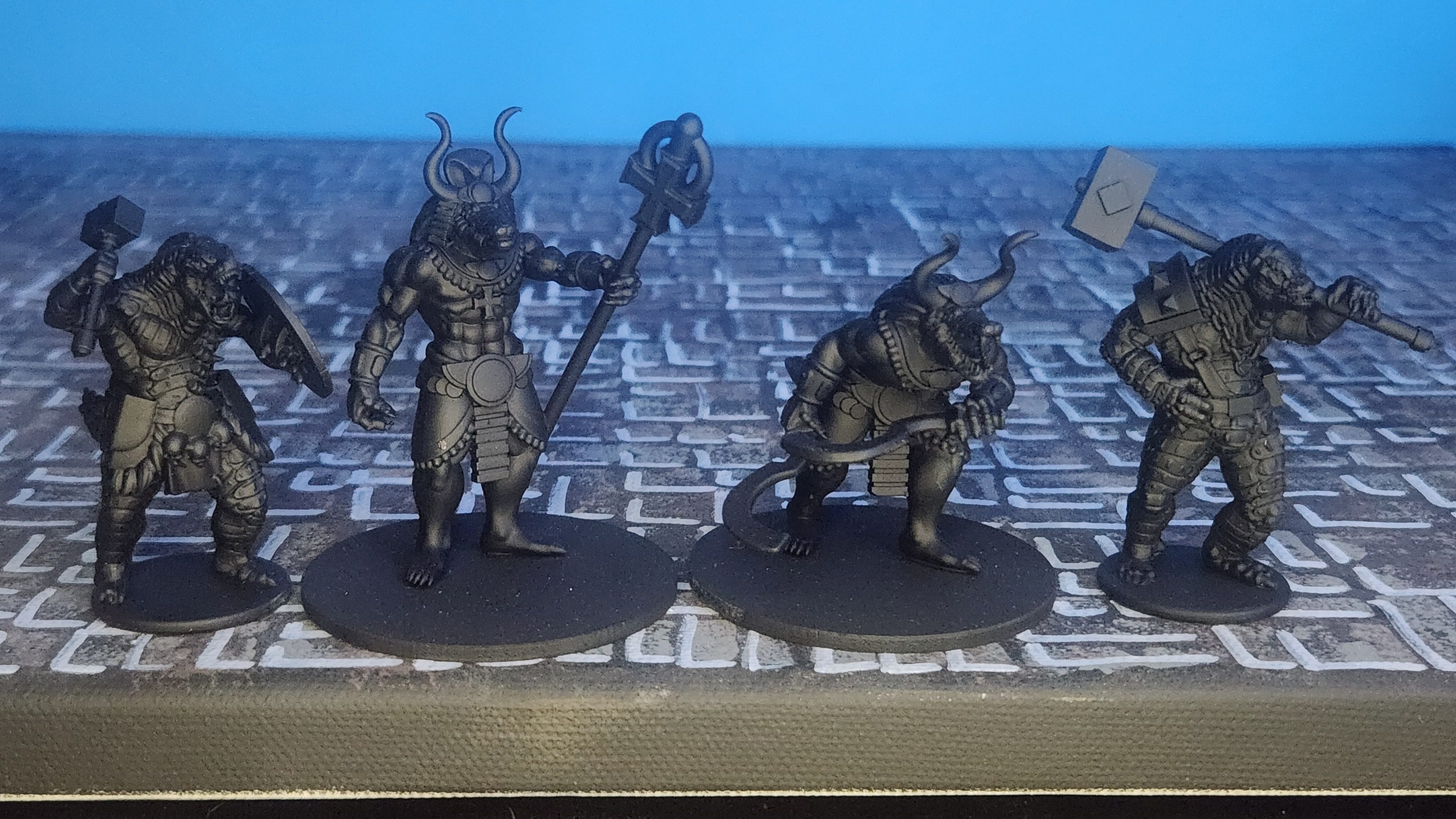 Some lizardfolk along with a pair of Sorbek models. These guys are printed (resin) and primed black. I really like the details you get with a resin printer.