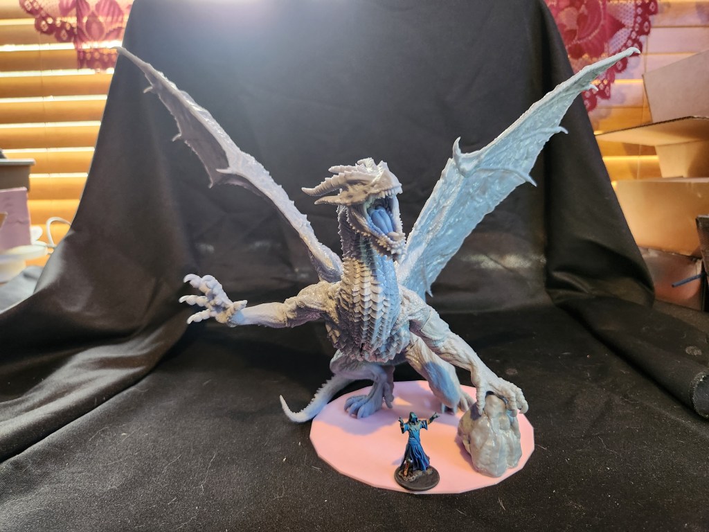The model is from The Printing Goes Ever On. It is the reward for 1 year of membership. It comes in 14 parts (I think) that I printed over a week on my resin printer. I only had 2 failed parts so not too bad. I will finish this dragon when my new UV flashlight comes in. I want to fill in the gaps and seams, but running it outside every 2 minutes is becoming a pain. I will prime it in black, paint it red (probably), and place it on my shelf.