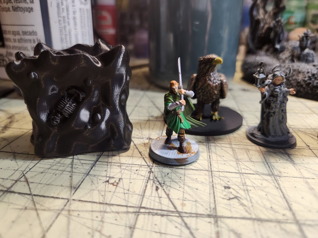 There is an elf warrior from The Printing Goes Ever On printed in resin. He is almost completely painted and should be done by Sunday. He just needs a black wash on the metal and the base needs to be painted black.