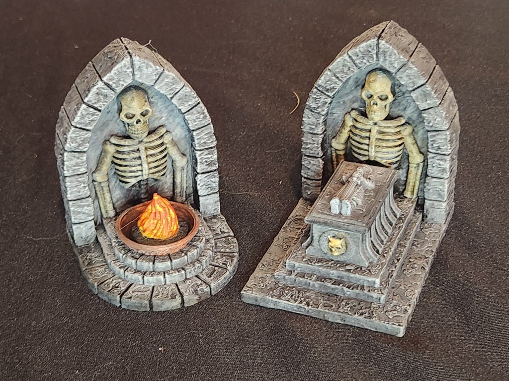 Here are a pair of skeleton wall pieces from Fat Dragon Games printed with filament on an FDM printer. I primed them black, overbrushed with dark gray, ivory on the bones, black wash, then light gray dry brush, making sure to highlight the figure on the top of the sarcophagus. These are nice pieces to drop on a tomb scene or ancient dungeon.