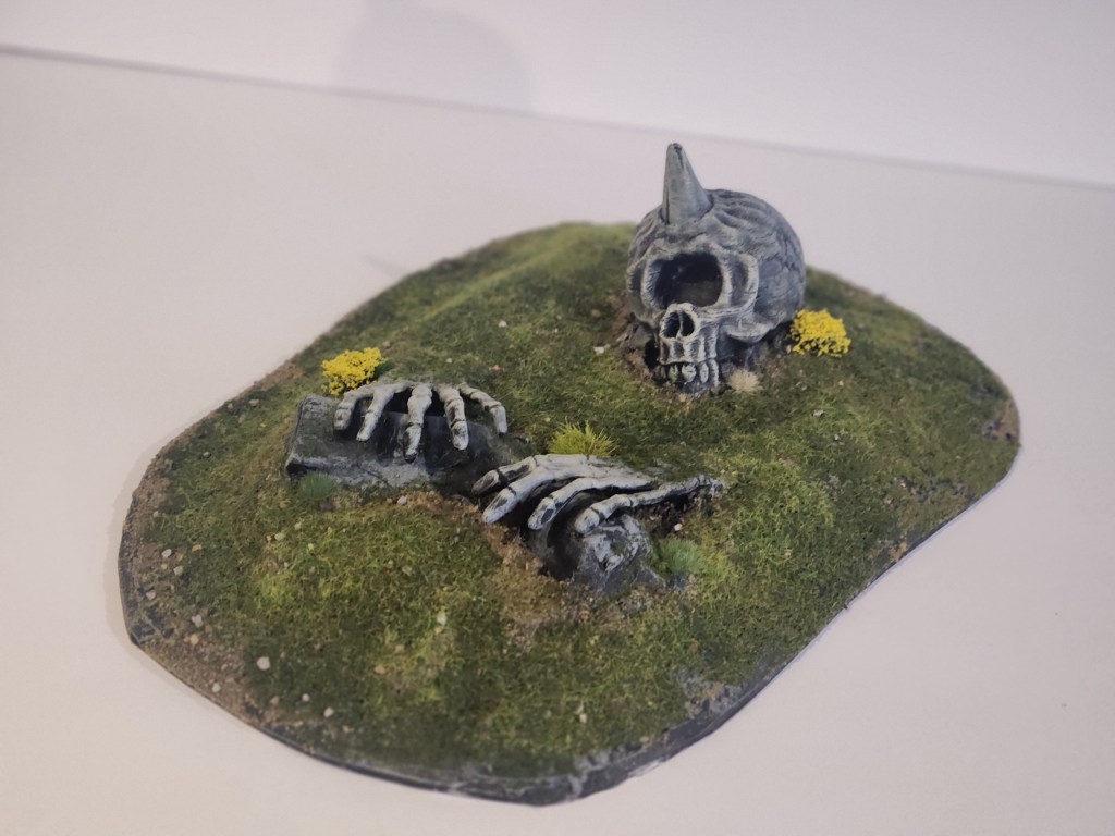 I dry brushed ivory onto the skull and hands of the model then I used super glue to add the grass tuffs and flowers to the terrain piece. I quick spray of matte clear coat and the piece is ready for the table.
