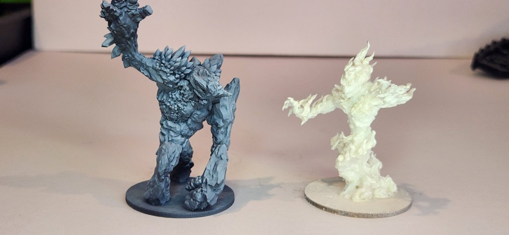 Four elementals are ready for painting. I primed the fire elemental white since it is made of fire and doesn’t have shadows on it. I will paint it yellow then orange then red to get a good fire effect. The others will take some standard colors (Grays and blues)