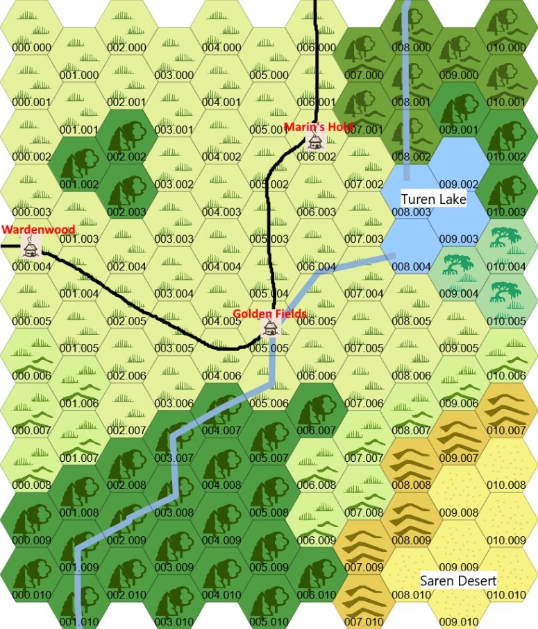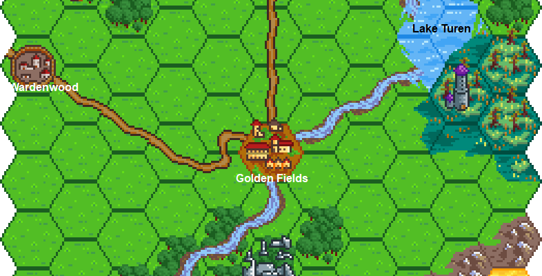 Here is the same map (with a few of the other locations recently placed for the DM) from Tiled using the 16-bit tileset. It gives me an old-school feel like something you would see while playing Legend of Zelda. One thing that is missing is the hex coordinates in Tiled. I will have to see if there is a way to do it. If you know how, please leave a comment and let me know. I would really appreciate it.