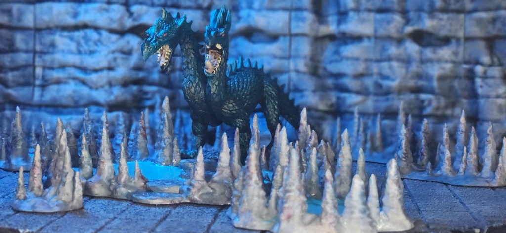 The stalagmites are also finished this week. I printed them out on my FDM printer. I used a sponge to apply a few different colors and then dry-brushed them with a few grays. I like how they came out. I did the water with glue and India ink and then covered that with a little resin and India ink. I think I can do a better job with a two-part resin. I will try that on the next run. I did record this process so expect to see that in a future video,
