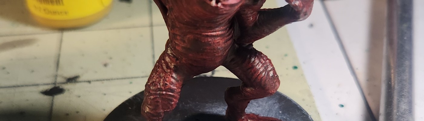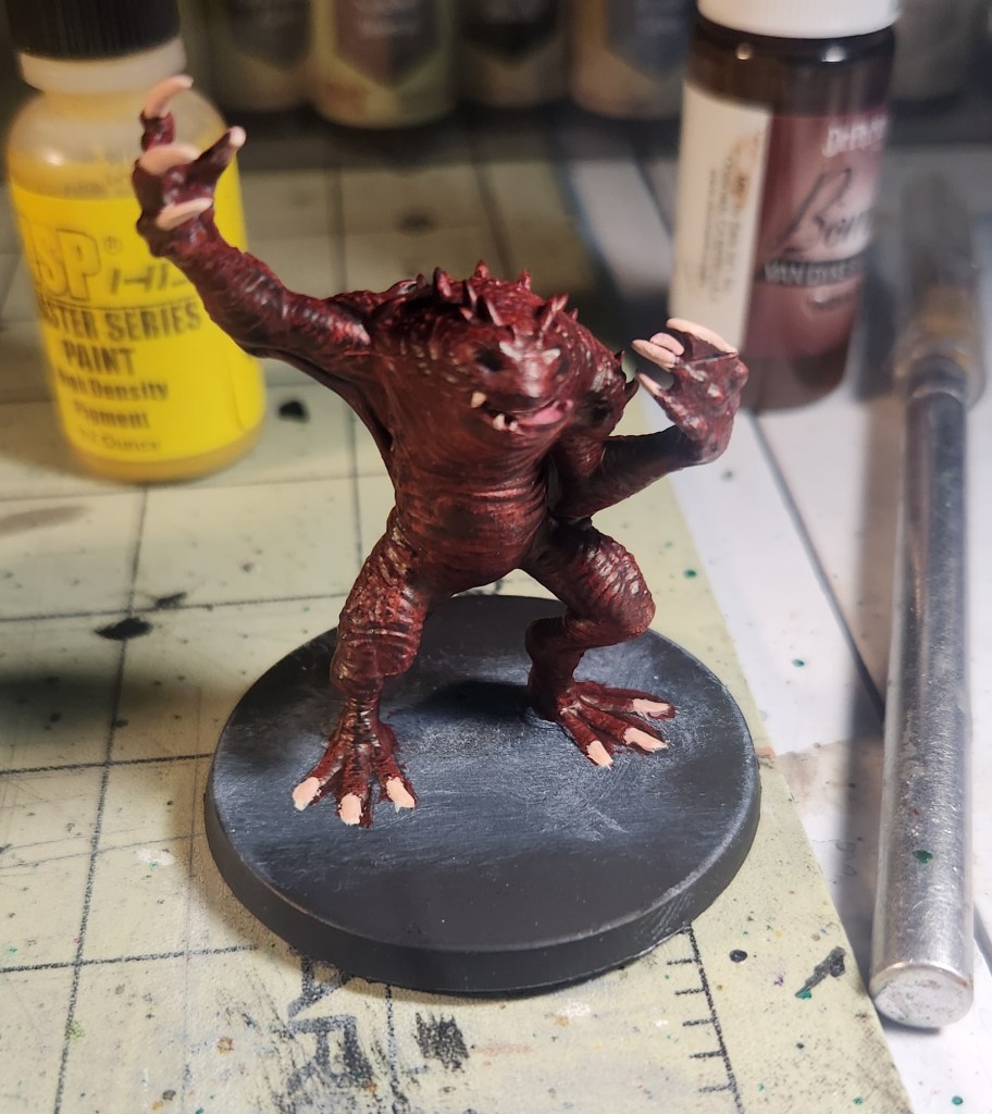 The first is a Red Slaad from EC3D Designs. It is almost complete. I just need to touch up the claws, add a wash, and paint the base.
