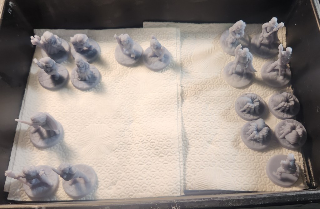 I have all four of the dwarves, two halflings, one human, and 2 elves printed out. The rest are on the printer now and will be done by the time I get home from work. I also have the four skeletons, four spiders, and a ghoulish figure printed. The stirges and spider swarm are on the printer now as well. (The Elegoo Saturn 3’s build plate holds A LOT of miniatures) When these are all printed, I am going to prime them black and probably give them a quick SlapChop drybrush of white to bring out the details.