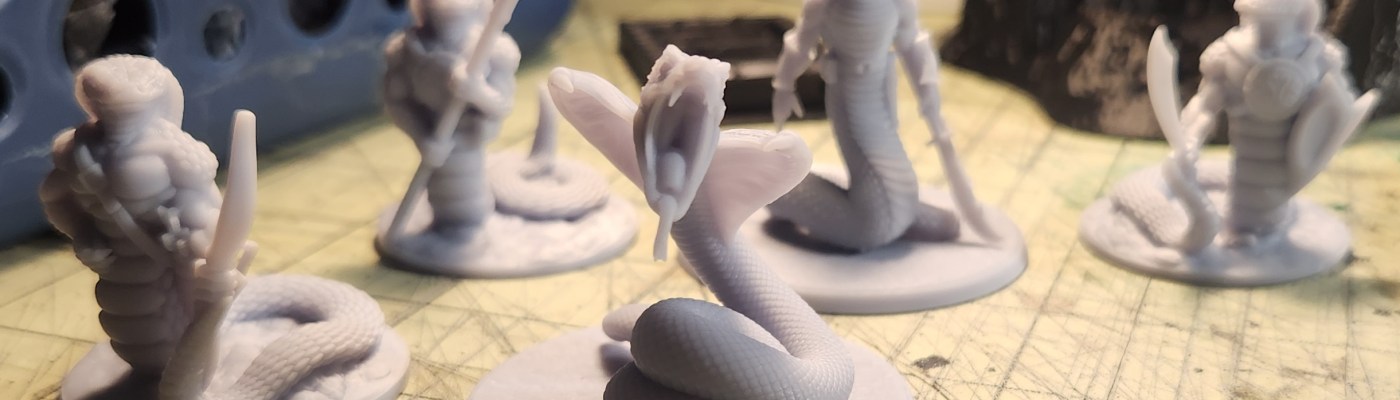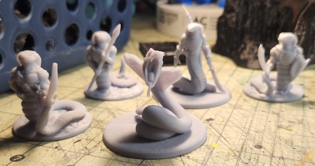 This week, I am working on a set of snakemen and their pet snake. All of these models were printed on my Elegoo Saturn 3 resin printer. I have more models from Brite Minis that I will try to get printed later today.