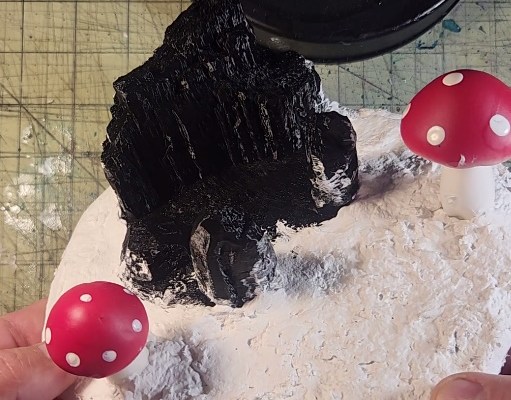 I attached the model and the mushrooms to a piece of foam core with hot glue, then added Sculptamold to the terrain to make a more realistic ground texture.