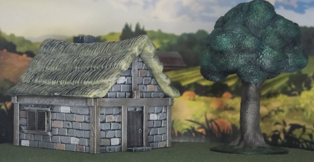 First, I painted another cottage and another tree. The cottage is from The Printing Goes Ever On, and the tree is from Fat Dragon Games.