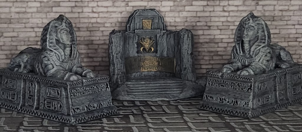 A few Sphinxes and a Wall of Words. The wall is from The Printing Goes Ever On and the sphinxes are from EC3D Designs. These pieces would look good in a tomb encounter.
