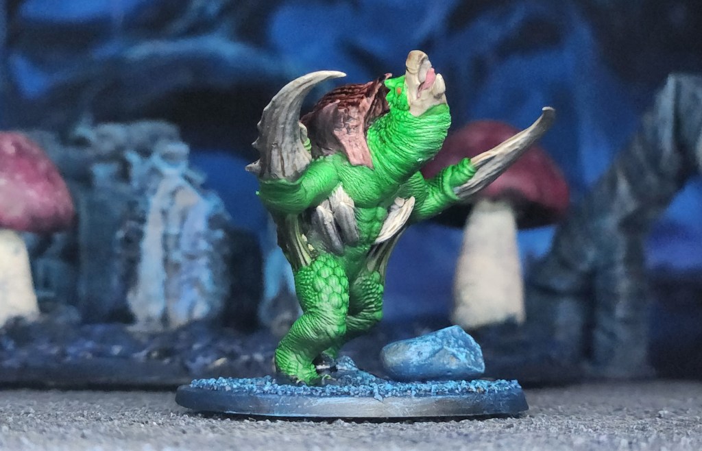 Another model from Beasts and Baddies, this Hook Horror looks great for the table. The bone hooks and turtle shell make this model look like a formidable foe. I stuck to greens and browns with bony matter speed paint for the bony parts.
