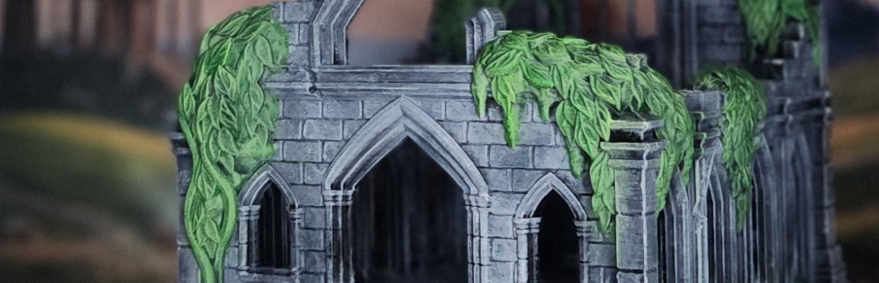 I printed and painted another one of these ruined buildings. I like using these on the table. I have a few, and I even try to keep one or two in my Etsy store in case you want one. (I have painted and bare PLA if you want to paint your own)