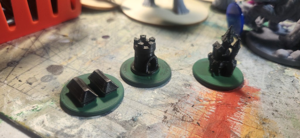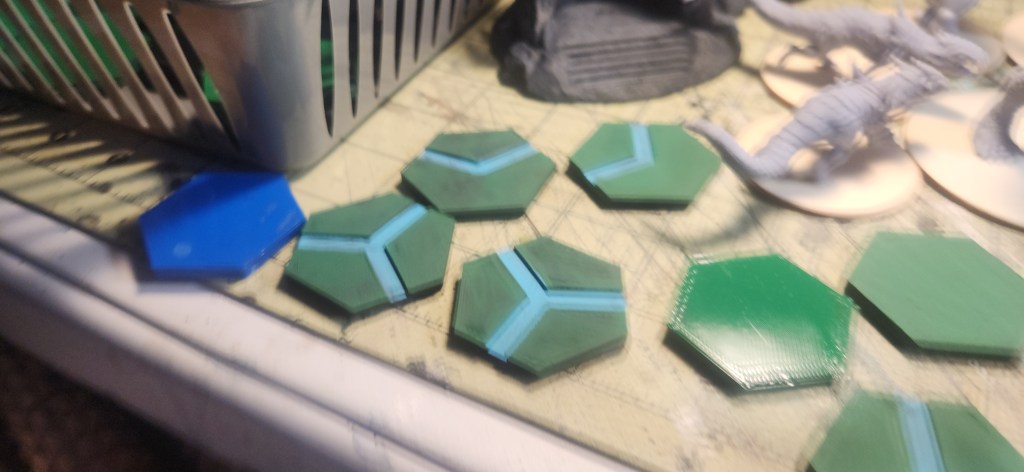 I also continued working on the hex tile set. I got a few more tiles printed, and I even created some for rivers using the blank STL and Tinkercad.