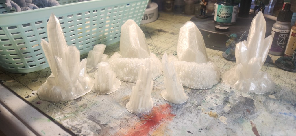 Meanwhile, my FDM printer is loaded with clear crystal filament, so naturally… I printed crystals! I plan to paint the bases to match my Underdark terrain. Still debating whether to tint the crystals with a watered-down ink or just leave them as-is. What do you think? Let me know in the comments—I’d love your input!