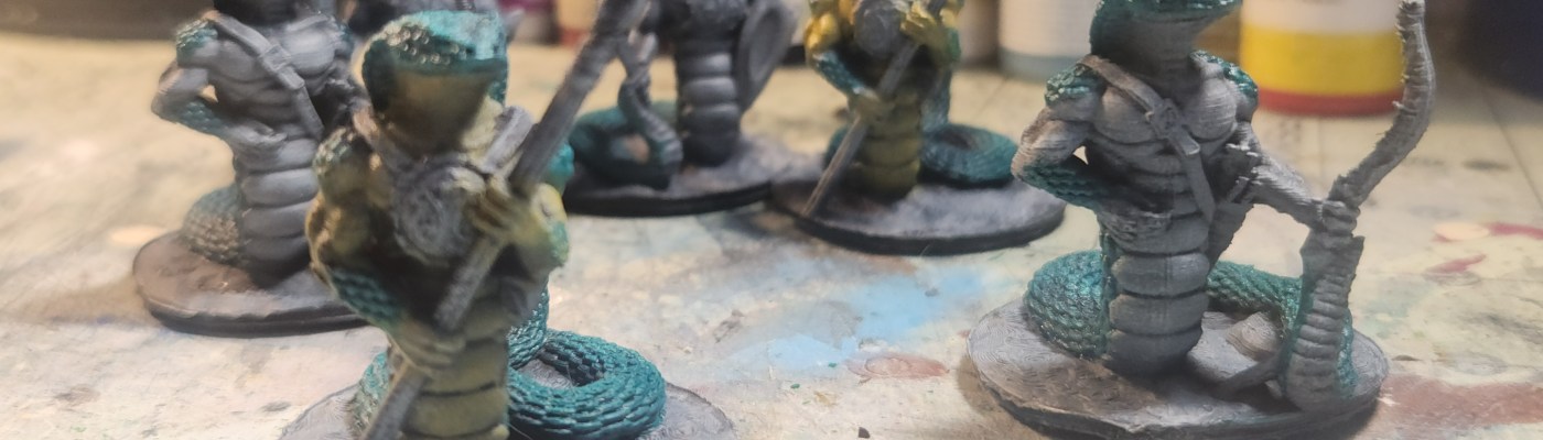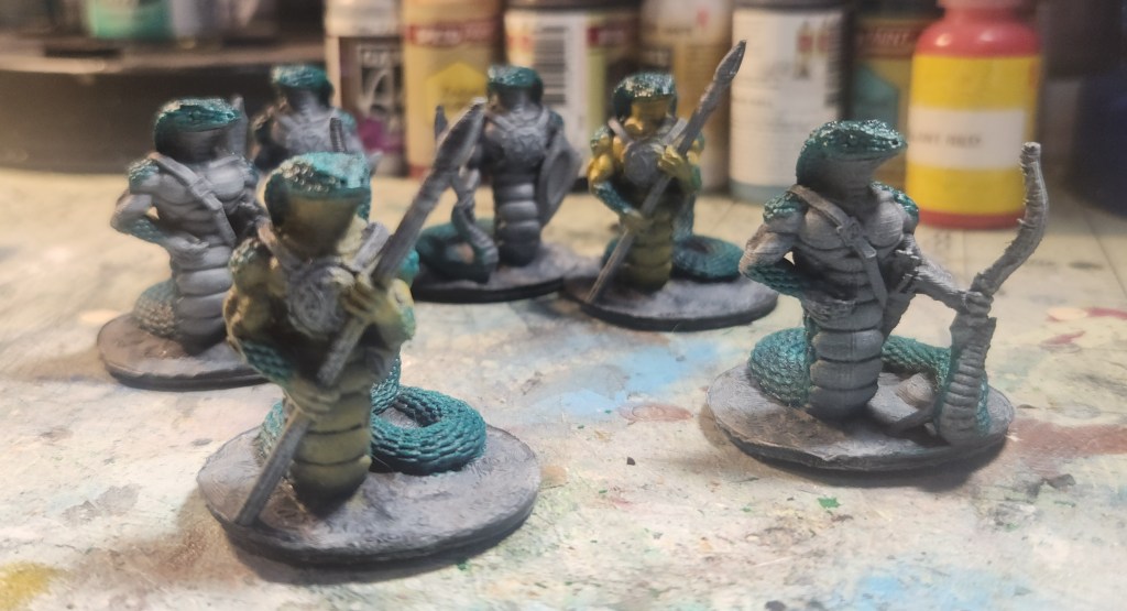 I was able to put a bit of paint on these snakefolk models. I started with a light yellow for the underbellies on the spearmen, but now I’m thinking Orc Skin might be a better fit. We’ll see—still deciding!
