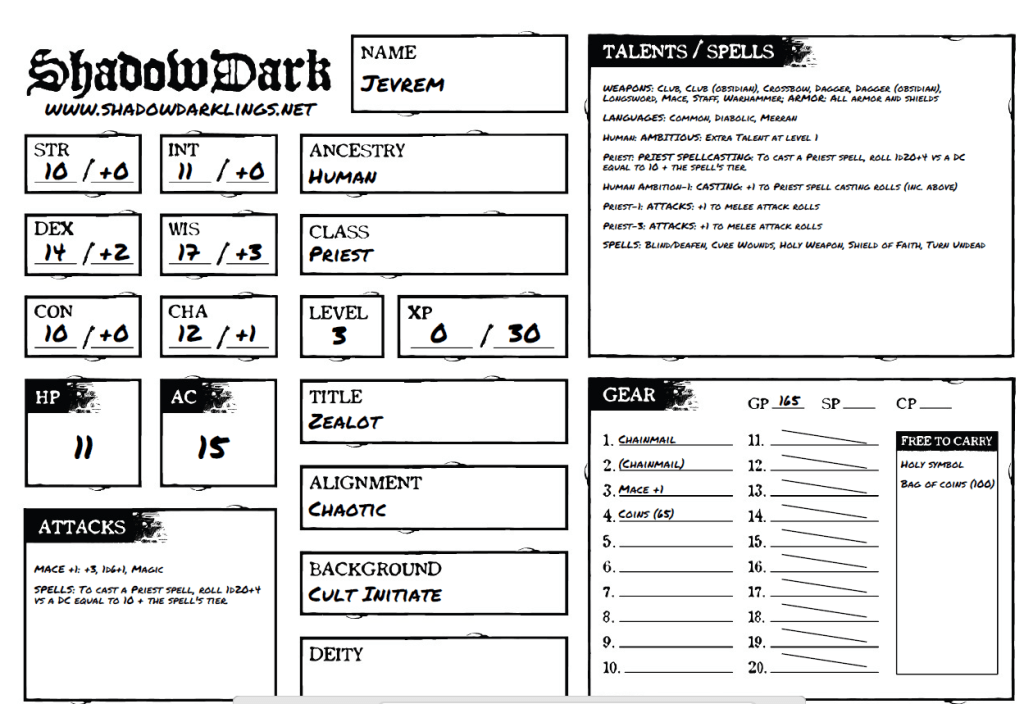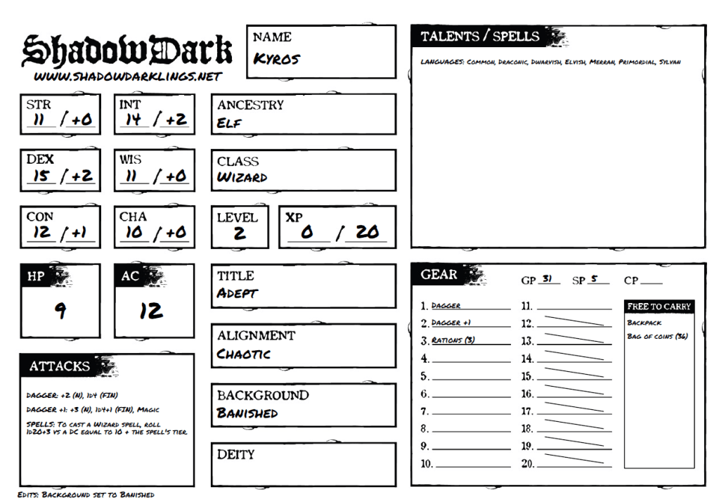Using Shadowdarling.Net, I made the basic sheets for Kyros the Elf Wizard and Jevren the Human Priest. This is a great online app that allows you to create characters quickly using a varaiety of sources.