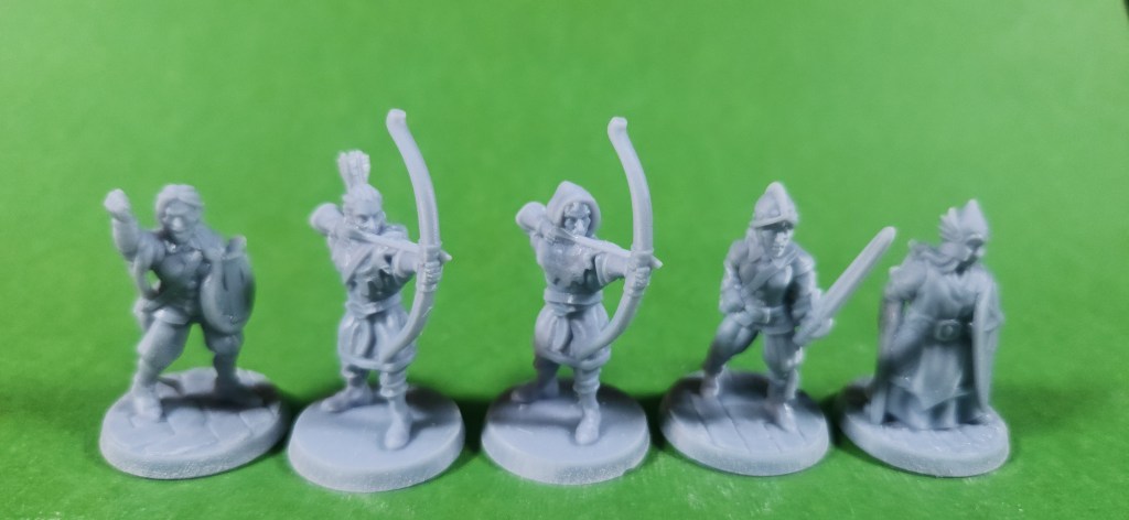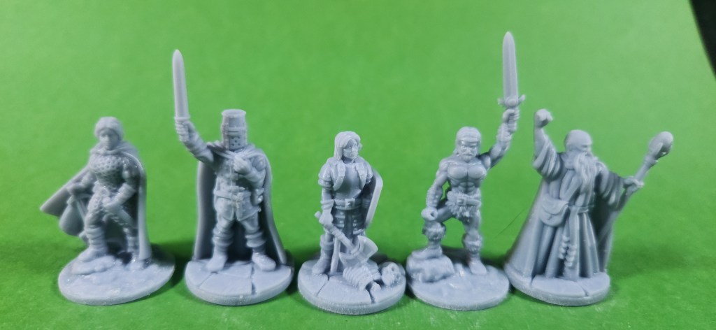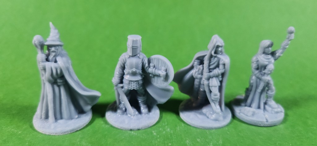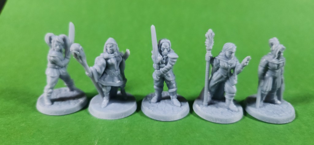 The second group of miniatures I’ve been working on is a set of human adventurers from Fat Dragon Games. This collection includes nine resin-printed minis, covering a nice spread of classic adventuring roles, and they’ll be joining the elves as another ready-to-paint option in the Etsy store.