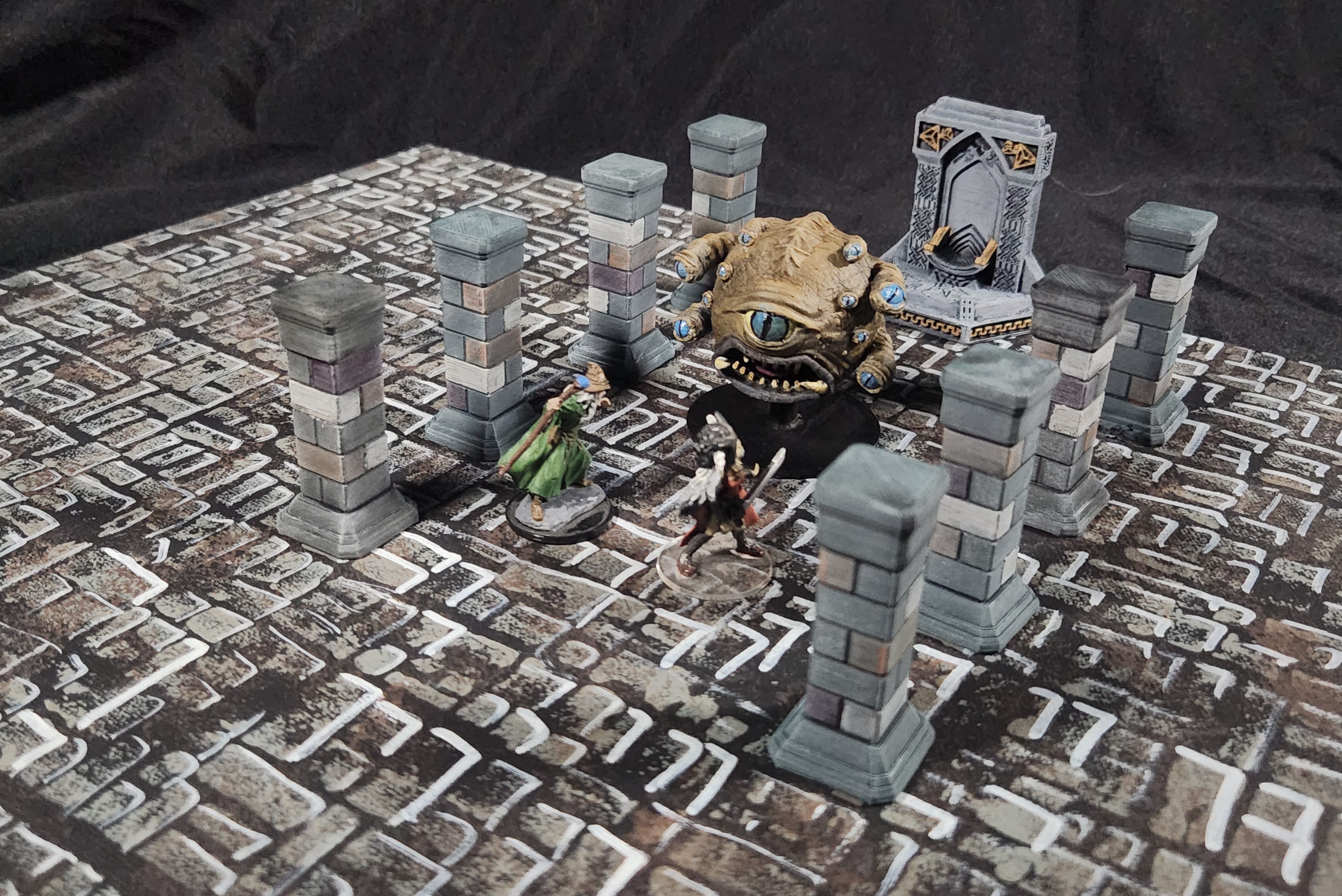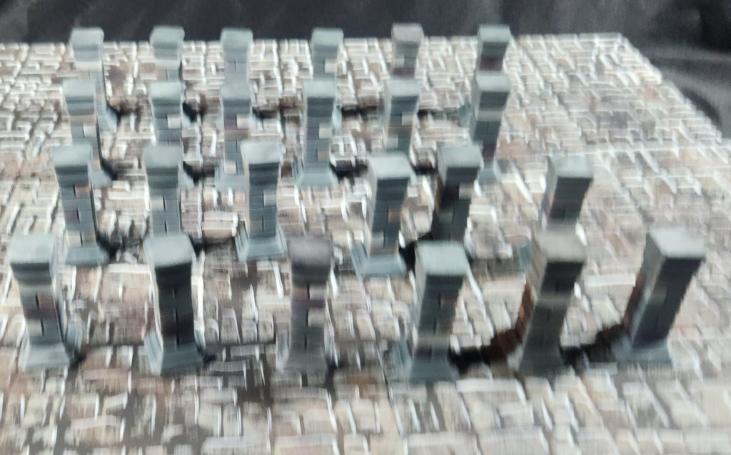 Sorry for the blurry picture, but I managed to print and paint 24 more square pillars this week. That brings me up to three full sets of eight pillars, which helps refill what had been marked out of stock in the shop. Below is a shot of them set up on the table during an encounter, showing how well they fill space, create cover, and add some solid vertical interest to the scene.e is a picture of the set up on the table in an encounter.