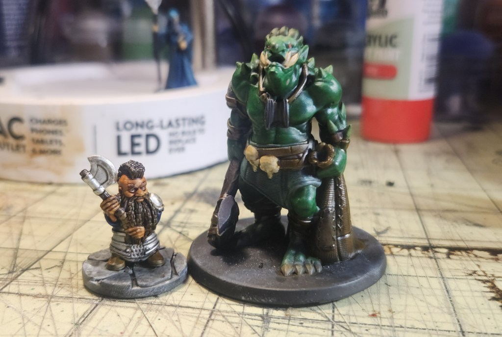 The dwarf comes from Fat Dragon Games, while the troll is from EC3D Design. Both of these models are well into the home stretch and quickly approaching the finish line. At this point, they just need a bit of attention on their bases to really tie them into the table, followed by a careful once-over to make sure all the small details were picked out. After that final pass, these two will be officially finished and ready to join the rest of the painted crew.
