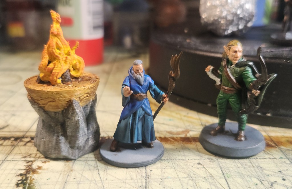 I’m not entirely sure where the burning altar originally came from, but the wizard is from a Humble Bundle and the elf is from EC3D Design. All three of these models are well along in the process and firmly in the “almost finished” category. The burning altar just needs a little more attention on the censer—most likely a black or sepia wash to help bring out the runes—before I can officially call it done. The wizard and the elf are in a similar place, with only their bases left to finish and a quick final inspection to make sure I didn’t miss any small details. Once that’s wrapped up, all three will be ready to hit the table.