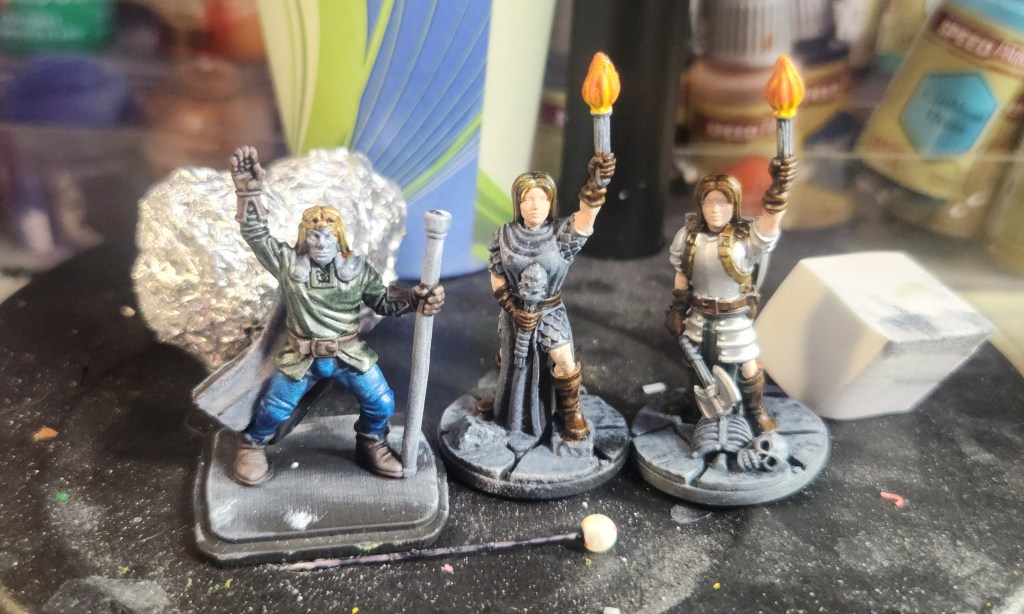 These models are still very much in the early stages of painting. The wizard comes from the HeroQuest reprint I picked up, and the female adventurers are from Fat Dragon Games. I’ve managed to get a few base colors down on each of them, but there’s still plenty of work ahead—layers, details, shading, and all the little touches that really bring them to life. They’ve got a long way to go, but the groundwork is officially in place.