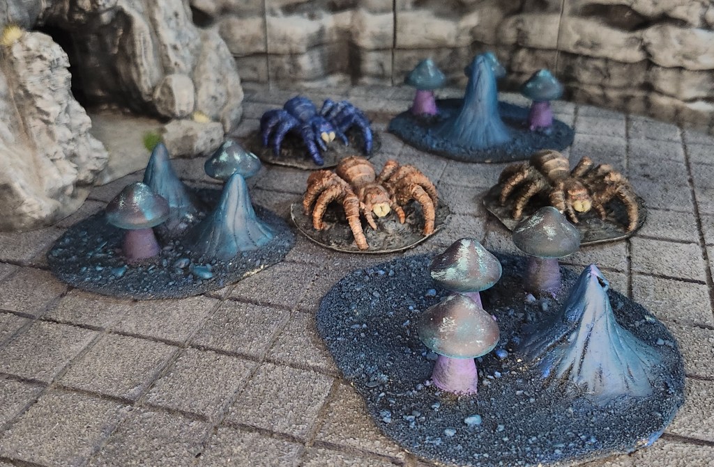 The large spiders are from Fat Dragon Games and were printed on the FDM printer. After printing, I gave each of them a light dry brush with white to bring out the details, then followed up with speed paints. I used different color schemes for each spider so they would all feel unique on the table rather than look like a cloned swarm.