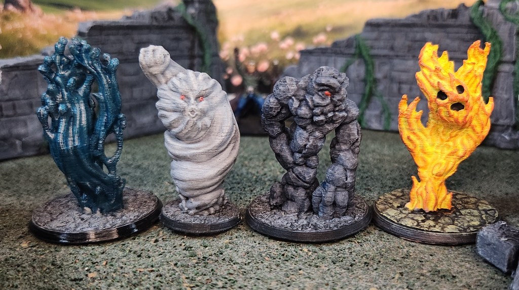 More FDM printed goodness this week! The elementals were painted up using my usual process and added to the Etsy shop stock, along with the painted ruined walls you can see in the background. Lately, a lot of my printing and painting time has been focused on building up inventory for the store, so there are plenty of options available.